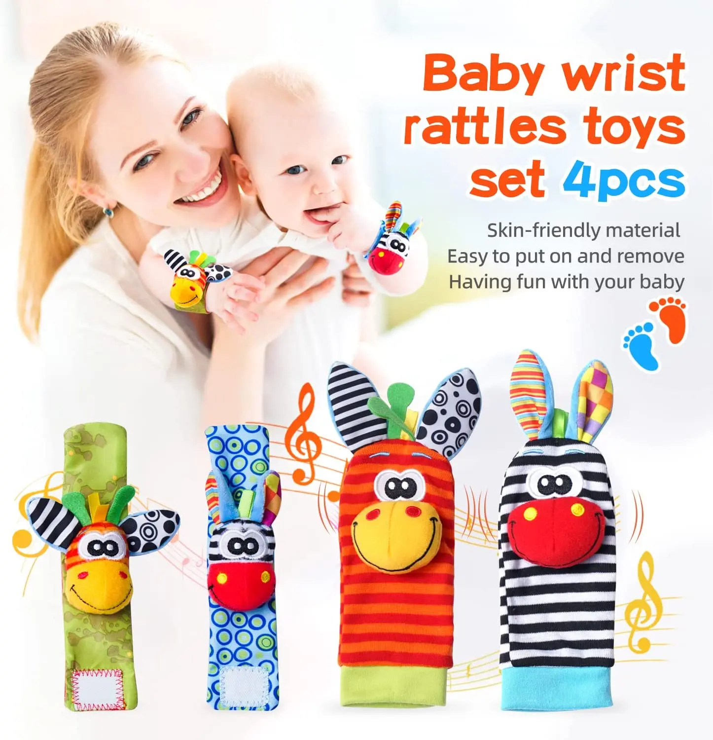 Soft, colorful wrist rattles and foot finder socks for babies 0–12 months. Stimulates sensory development through sight, sound, and touch.