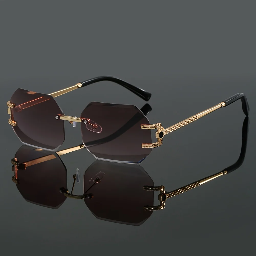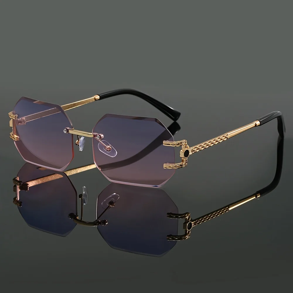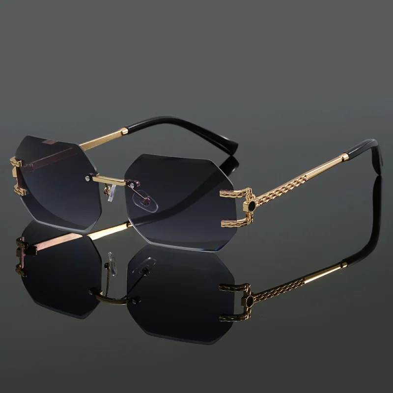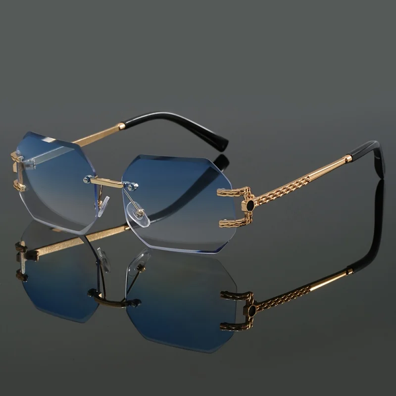 Stylish frameless sunglasses with metal temples and mirror lenses, perfect for travel and casual wear.