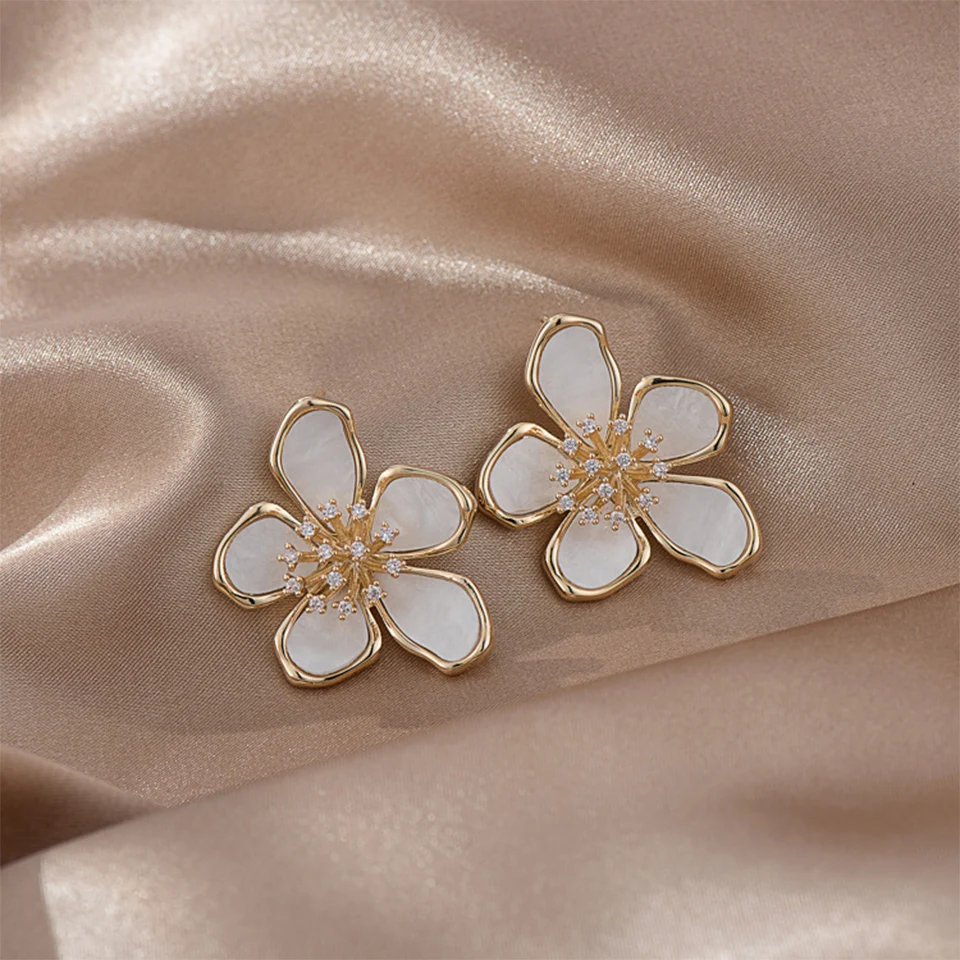 Cute Korean-style gold flower earrings with crystal zircon details, perfect for parties and daily fashion.